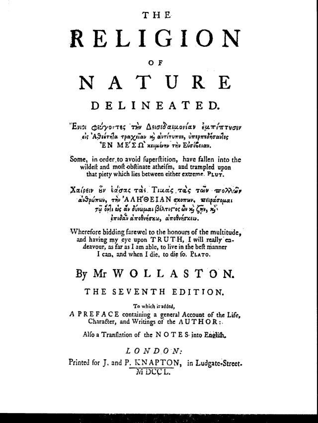 The Religion of Nature delineated, by William Wollaston, was first published in 1722. This text is based on Kessinger Publishing's facsimile (ISBN 0-7661-6894-8) of J. and P. Knapton's edition of 1750, prepared by John Clarke — in which Clarke added translations of Wollaston's notes, at the request of Queen Caroline.